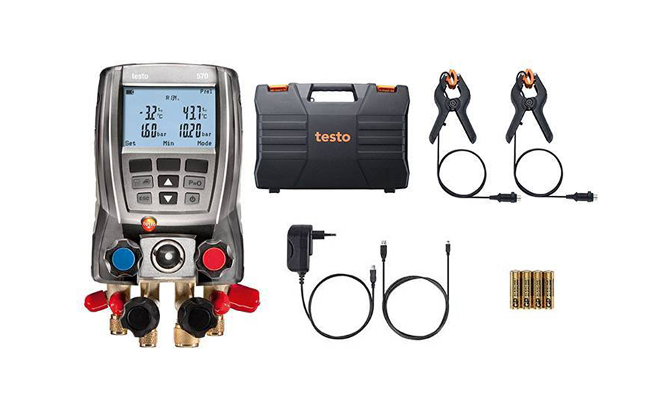 testo 570 專業(yè)級(jí)電子冷媒表組套裝、包括主機(jī),4通閥組,內(nèi)部數(shù)據(jù)存儲(chǔ)器、集成真空測(cè)量探頭,3個(gè)溫度探頭連接,2個(gè)鉗形探頭、testo EasyKool 專業(yè)電腦操作軟件(用戶可下載)、USB數(shù)據(jù)線,儀器箱、電源適配器,電池以及出廠報(bào)告。