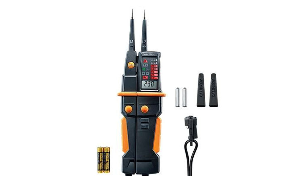 電壓測試儀 testo 750-3,包括電池、探頭保護、探頭套、校準記錄和操作說明。